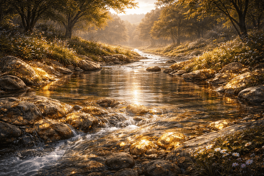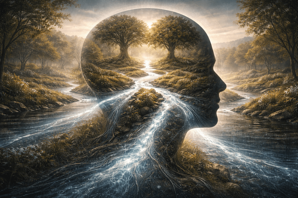 Vanbinnen vindt een constante uitwisseling plaats tussen de bron en de manifestatie. Wanneer de verbinding met de ene rivier open is, stroomt je leven vloeiend naar buiten.